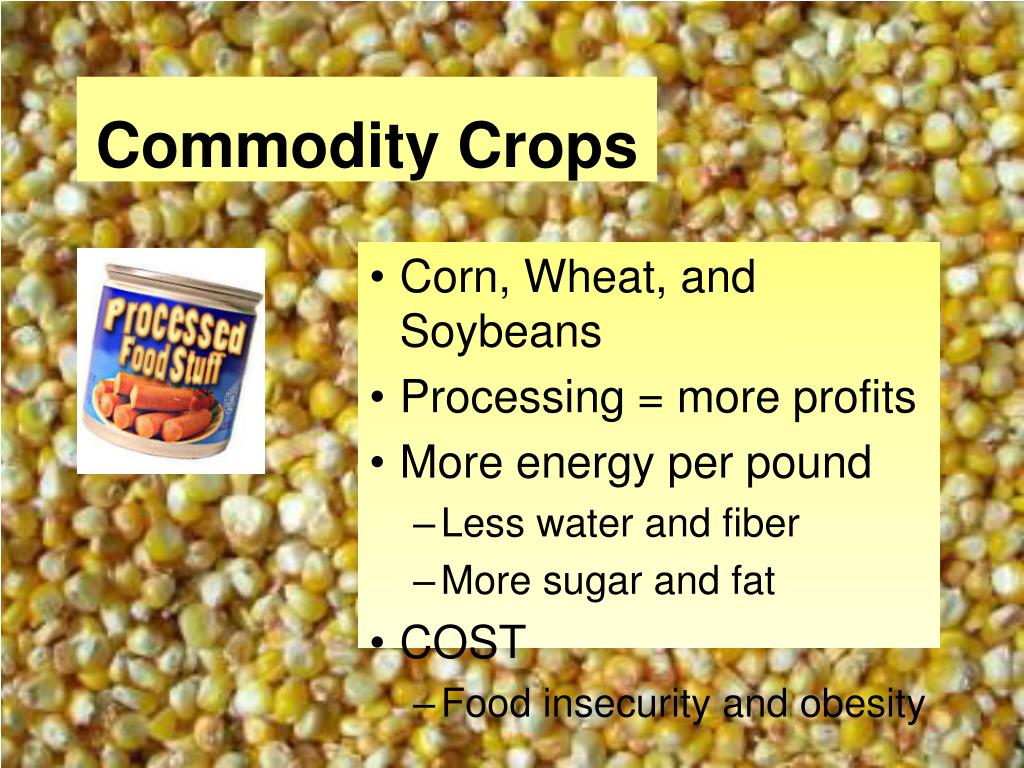 Commodity Crops • Corn, Wheat, and Soybeans • Processing = more profits • More energy per pound • Less water and fiber • More sugar and fat • COST • Food insecurity and obesity