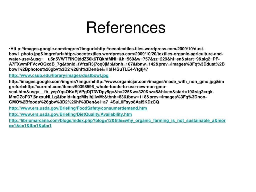 References Htt p://images.google.com/imgres?imgurl=http://oecotextiles.files.wordpress.com/2009/10/dust-bowl_photo.jpg&imgrefurl=http://oecotextiles.wordpress.com/2009/10/20/textiles-organic-agriculture-and-water-use/&usg=__u5n5VWTFINOjddZ50k6TQkhtMNI=&h=569&w=757&sz=229&hl=en&start=9&sig2=PF-A7FXwmPFVcvOQxdB_7g&tbnid=tVfzsR3j7oq0jM:&tbnh=107&tbnw=142&prev=/images%3Fq%3Ddust%2Bbowl%2Bphotos%26gbv%3D2%26hl%3Den&ei=HbH4SuTLE4-Vtgfj47 http://www.csub.edu/library/images/dustbowl.jpg http://images.google.com/imgres?imgurl=http://www.organicjar.com/images/made_with_non_gmo.jpg&imgrefurl=http://current.com/items/90398596_whole-foods-to-use-new-non-gmo-seal.htm&usg=__fb_yepYqsOKaEjVPgDjT3VDpy5g=&h=225&w=320&sz=8&hl=en&start=19&sig2=rgk-MmGZoP37j6nxxuNLLg&tbnid=iuqzMlsihjjlwM:&tbnh=83&tbnw=118&prev=/images%3Fq%3Dnon-GMO%2Bfoods%26gbv%3D2%26hl%3Den&ei=a7_4SuL0Fsyo8Aai5KDzCQ http://www.ers.usda.gov/Briefing/FoodSafety/consumerdemand.htm http://www.ers.usda.gov/Briefing/DietQuality/Availability.htm http://libriumarcana.com/blogs/index.php?blog=12&title=why_organic_farming_is_not_sustainable_a&more=1&c=1&tb=1&pb=1