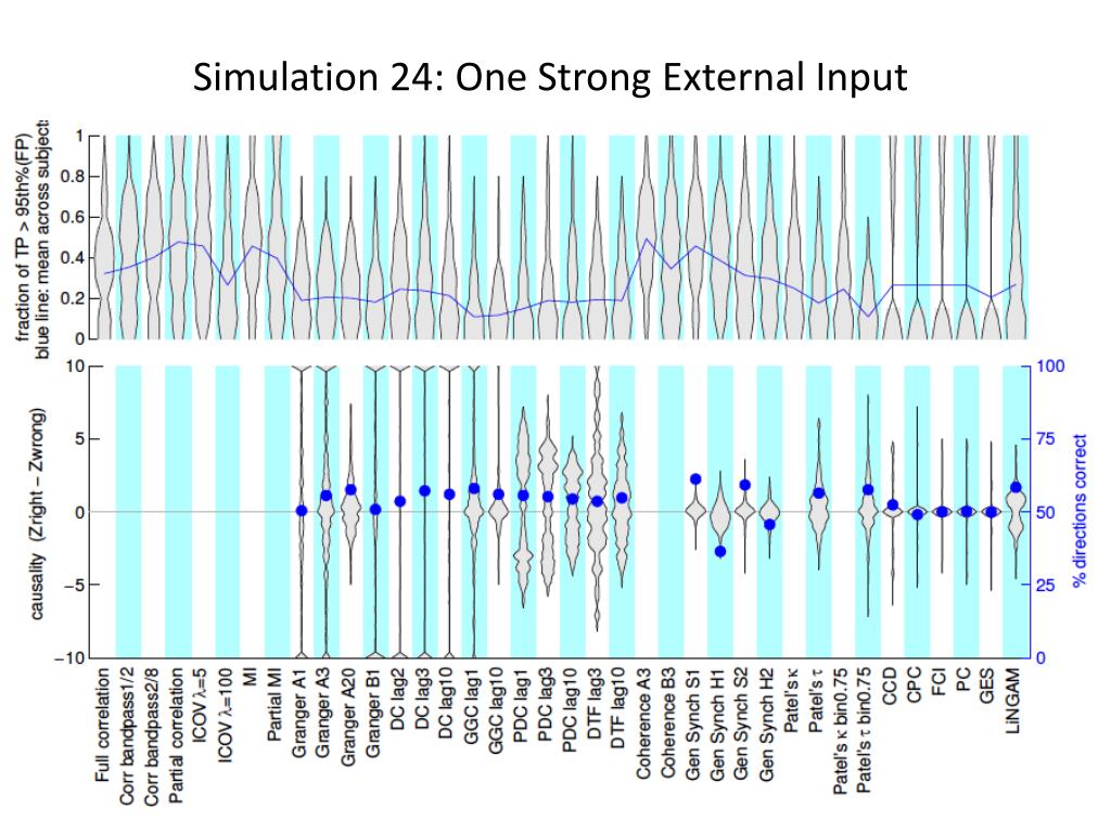Methods tested by Smith • DCM, SEM excluded; no search. (Not completely true.) • Full correlation in various frequency bands • Partial correlation • Lasso(ICOV) • Mutual Information, Partial MI • Granger Causality • Coherence • Generalized Synchronization • Patel’s Conditional Dependence Measures • P(x|y) vs P(y|x) • Bayes Net Methods • CCD, CPC, FCI, PC, GES • LiNGAM