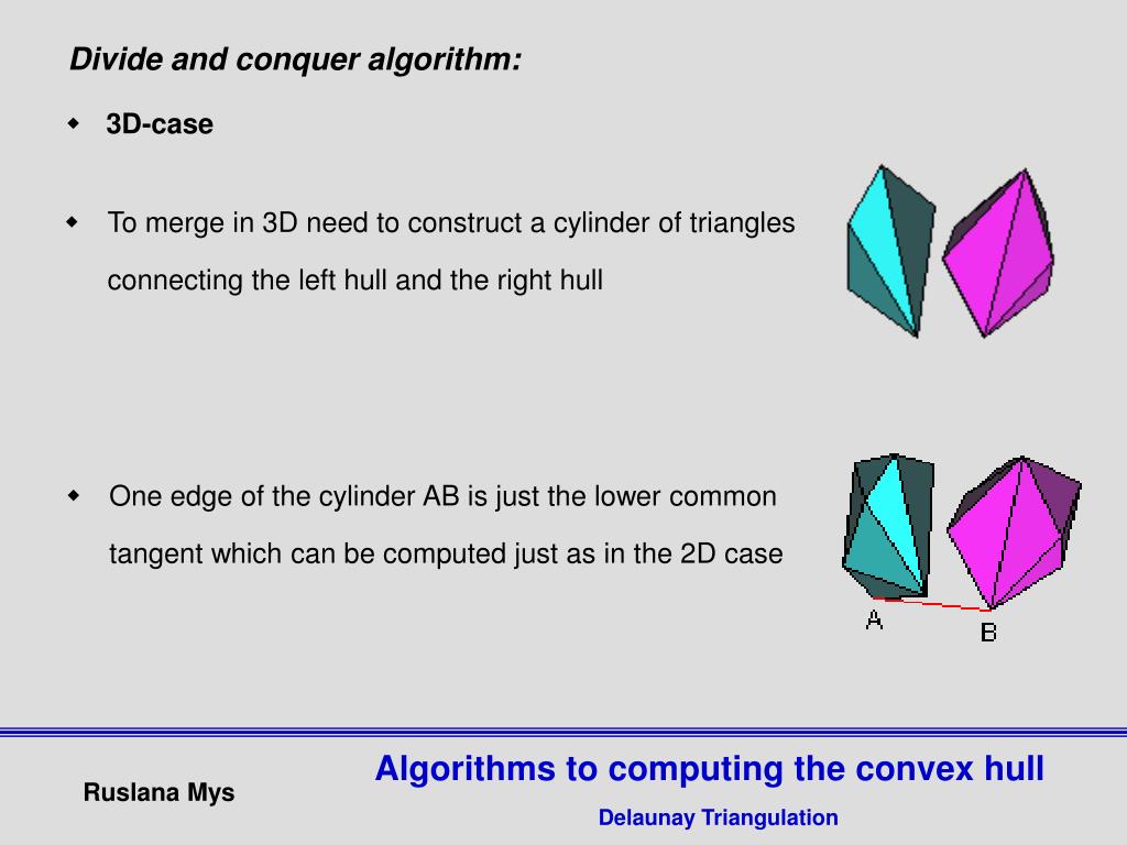 Divide and conquer algorithm: • 3D-case • To merge in 3D need to construct a cylinder of triangles connecting the left hull and the right hull • One edge of the cylinder AB is just the lower common tangent which can be computed just as in the 2D case Algorithms to computing the convex hull