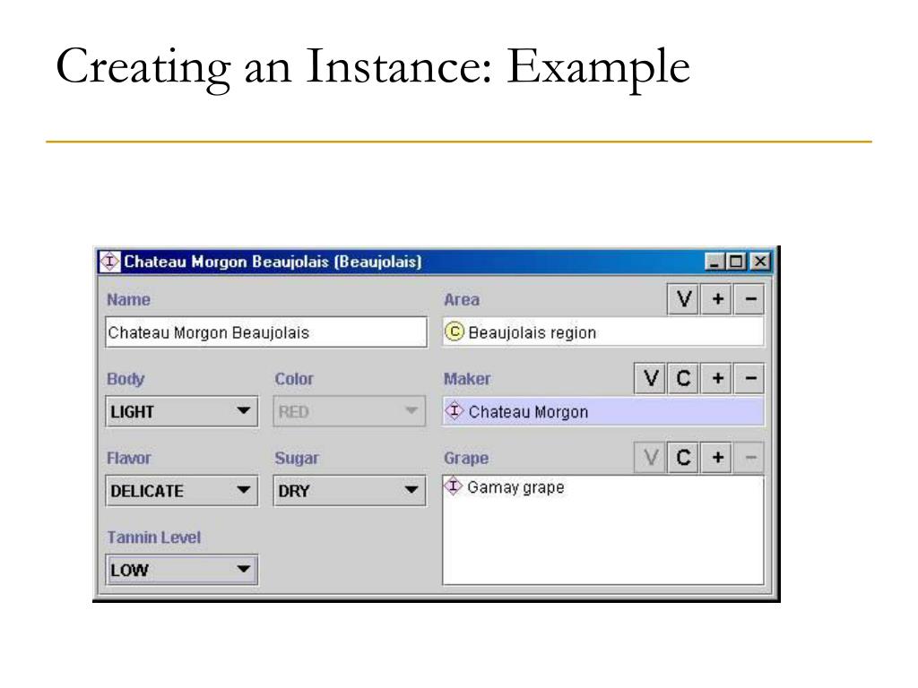 Properties (Slots) • Types of properties • “intrinsic” properties: flavor and color of wine • “extrinsic” properties: name and price of wine • parts: ingredients in a dish • relations to other objects: producer of wine (winery) • Simple and complex properties • simple properties (attributes): contain primitive values (strings, numbers) • complex properties: contain (or point to) other objects (e.g., a winery instance)