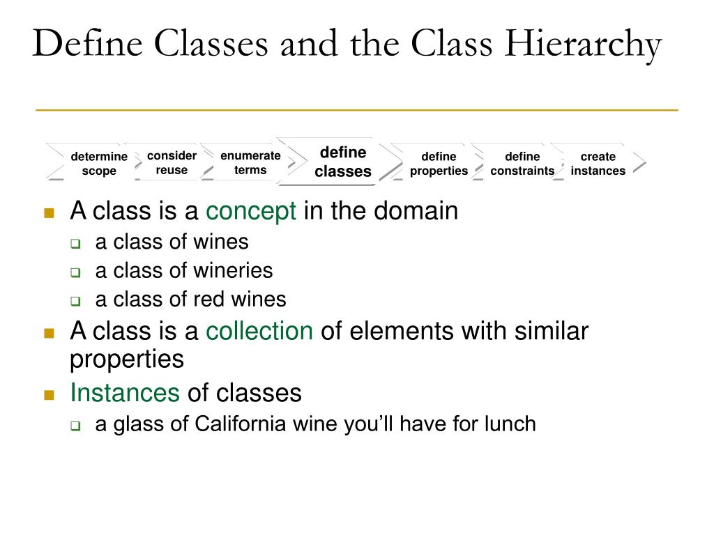 Define Classes and the Class Hierarchy • A class is a concept in the domain • a class of wines • a class of wineries • a class of red wines • A class is a collection of elements with similar properties • Instances of classes • a glass of California wine you’ll have for lunch defineclasses considerreuse enumerate terms determinescope defineproperties defineconstraints createinstances