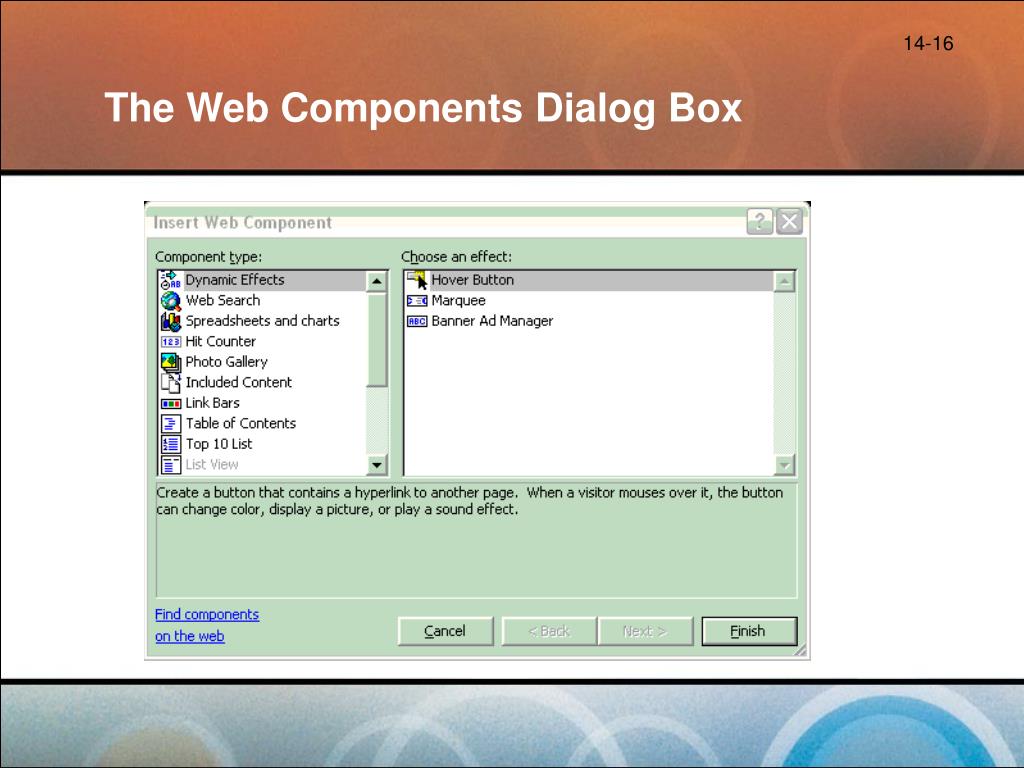 Creating Web Effects Easily In FrontPage, you can create a number of popular Web effects easily using the built-in effects available through the Web Components dialog box.