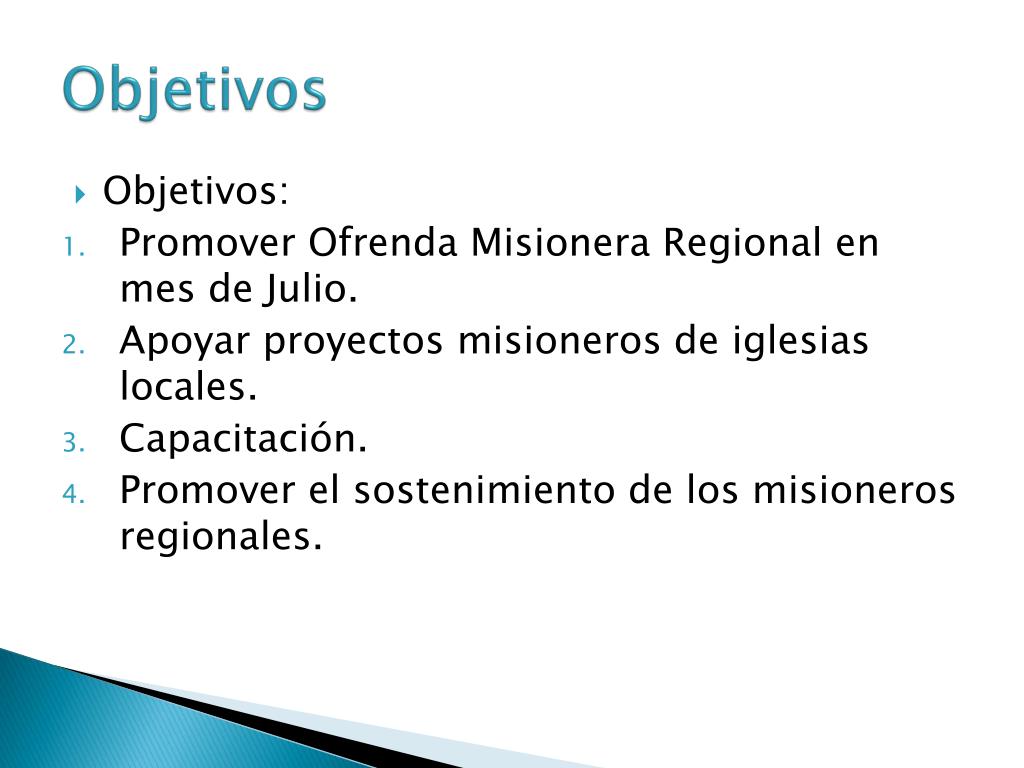 Objetivos • Objetivos: • Promover Ofrenda Misionera Regional en mes de Julio. • Apoyar proyectos misioneros de iglesias locales. • Capacitación. • Promover el sostenimiento de los misioneros regionales.