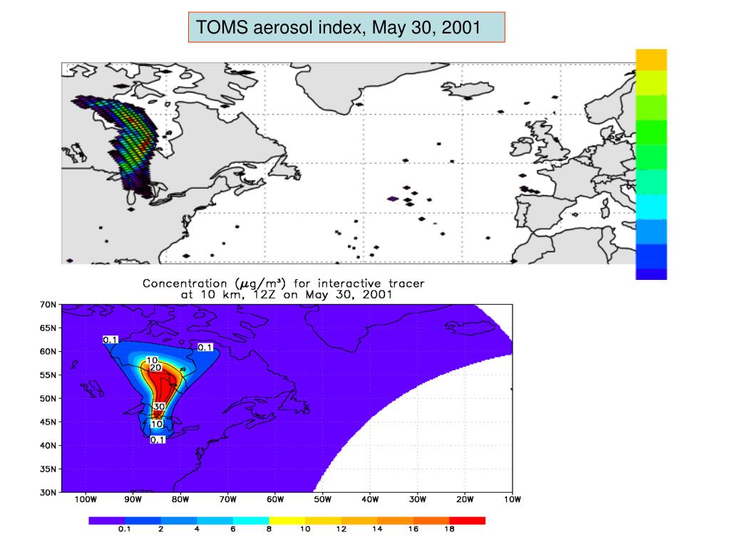Simulation Setup Regional domain in Polar Stereographic Projection 150W to 10W and 30N to 80N 60 vertical layers 300x300 grids horizontally with grid spacing of 25 km Time step 20s Aerosol initially distributed at 9.5 km in the area 106W to 114 W and from 63N to 66N With a constant mixing ratio of 10-3 g/kg. Total mass = 5kT Aerosol optical properties: Specific extinction coefficient = 4.5 m2/g (in visible) Single scattering albedo = 0.75 Asymmetry factor = 0.6 Simulations started at 18Z on May 29, 2001
