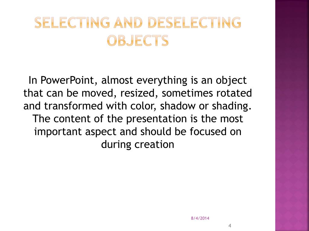 Selecting and deselecting objects In PowerPoint, almost everything is an object that can be moved, resized, sometimes rotated and transformed with color, shadow or shading. The content of the presentation is the most important aspect and should be focused on during creation