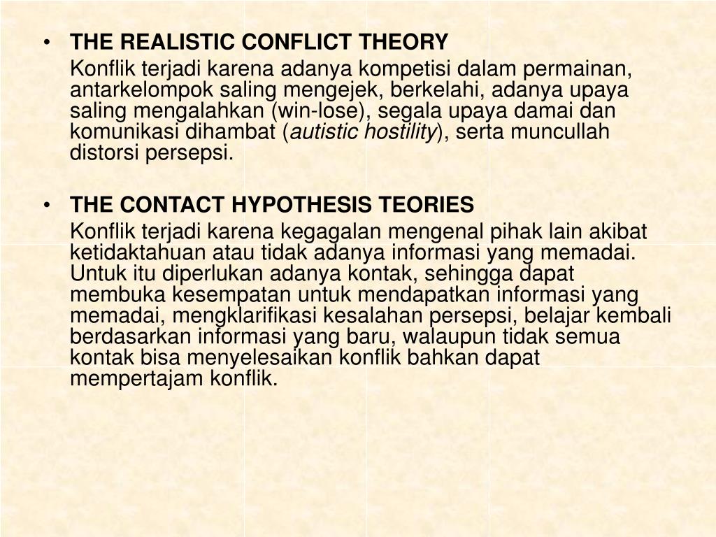 THE REALISTIC CONFLICT THEORY Konflik terjadi karena adanya kompetisi dalam permainan, antarkelompok saling mengejek, berkelahi, adanya upaya saling mengalahkan (win-lose), segala upaya damai dan komunikasi dihambat (autistic hostility), serta muncullah distorsi persepsi. • THE CONTACT HYPOTHESIS TEORIES Konflik terjadi karena kegagalan mengenal pihak lain akibat ketidaktahuan atau tidak adanya informasi yang memadai. Untuk itu diperlukan adanya kontak, sehingga dapat membuka kesempatan untuk mendapatkan informasi yang memadai, mengklarifikasi kesalahan persepsi, belajar kembali berdasarkan informasi yang baru, walaupun tidak semua kontak bisa menyelesaikan konflik bahkan dapat mempertajam konflik.