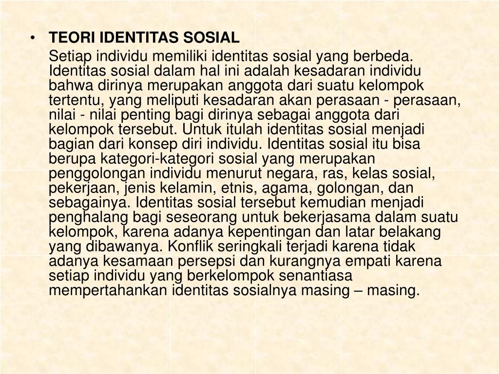 TEORI IDENTITAS SOSIAL Setiap individu memiliki identitas sosial yang berbeda. Identitas sosial dalam hal ini adalah kesadaran individu bahwa dirinya merupakan anggota dari suatu kelompok tertentu, yang meliputi kesadaran akan perasaan - perasaan, nilai - nilai penting bagi dirinya sebagai anggota dari kelompok tersebut. Untuk itulah identitas sosial menjadi bagian dari konsep diri individu. Identitas sosial itu bisa berupa kategori-kategori sosial yang merupakan penggolongan individu menurut negara, ras, kelas sosial, pekerjaan, jenis kelamin, etnis, agama, golongan, dan sebagainya. Identitas sosial tersebut kemudian menjadi penghalang bagi seseorang untuk bekerjasama dalam suatu kelompok, karena adanya kepentingan dan latar belakang yang dibawanya. Konflik seringkali terjadi karena tidak adanya kesamaan persepsi dan kurangnya empati karena setiap individu yang berkelompok senantiasa mempertahankan identitas sosialnya masing – masing.