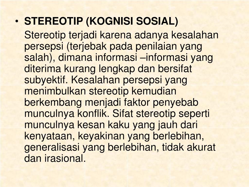 STEREOTIP (KOGNISI SOSIAL) Stereotip terjadi karena adanya kesalahan persepsi (terjebak pada penilaian yang salah), dimana informasi –informasi yang diterima kurang lengkap dan bersifat subyektif. Kesalahan persepsi yang menimbulkan stereotip kemudian berkembang menjadi faktor penyebab munculnya konflik. Sifat stereotip seperti munculnya kesan kaku yang jauh dari kenyataan, keyakinan yang berlebihan, generalisasi yang berlebihan, tidak akurat dan irasional.