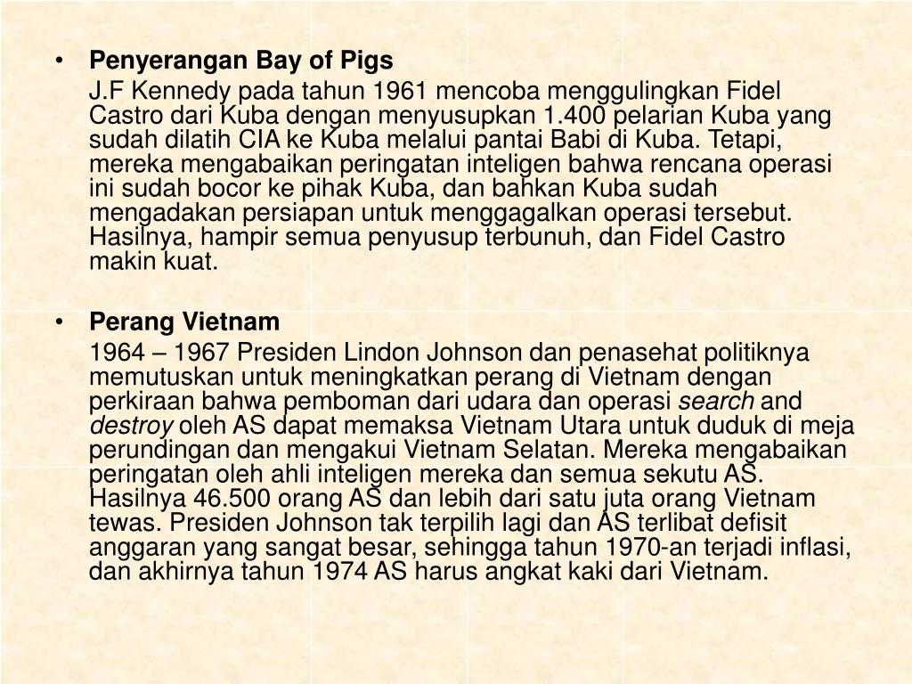 Penyerangan Bay of Pigs J.F Kennedy pada tahun 1961 mencoba menggulingkan Fidel Castro dari Kuba dengan menyusupkan 1.400 pelarian Kuba yang sudah dilatih CIA ke Kuba melalui pantai Babi di Kuba. Tetapi, mereka mengabaikan peringatan inteligen bahwa rencana operasi ini sudah bocor ke pihak Kuba, dan bahkan Kuba sudah mengadakan persiapan untuk menggagalkan operasi tersebut. Hasilnya, hampir semua penyusup terbunuh, dan Fidel Castro makin kuat. • Perang Vietnam 1964 – 1967 Presiden Lindon Johnson dan penasehat politiknya memutuskan untuk meningkatkan perang di Vietnam dengan perkiraan bahwa pemboman dari udara dan operasi search and destroy oleh AS dapat memaksa Vietnam Utara untuk duduk di meja perundingan dan mengakui Vietnam Selatan. Mereka mengabaikan peringatan oleh ahli inteligen mereka dan semua sekutu AS. Hasilnya 46.500 orang AS dan lebih dari satu juta orang Vietnam tewas. Presiden Johnson tak terpilih lagi dan AS terlibat defisit anggaran yang sangat besar, sehingga tahun 1970-an terjadi inflasi, dan akhirnya tahun 1974 AS harus angkat kaki dari Vietnam.