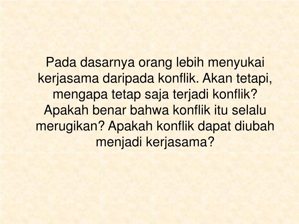 Pada dasarnya orang lebih menyukai kerjasama daripada konflik. Akan tetapi, mengapa tetap saja terjadi konflik? Apakah benar bahwa konflik itu selalu merugikan? Apakah konflik dapat diubah menjadi kerjasama?