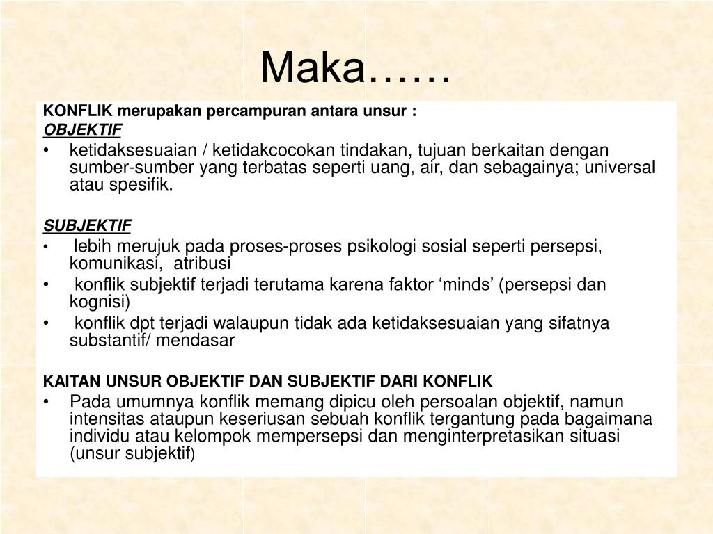 Maka…… KONFLIK merupakan percampuran antara unsur : OBJEKTIF • ketidaksesuaian / ketidakcocokan tindakan, tujuan berkaitan dengan sumber-sumber yang terbatas seperti uang, air, dan sebagainya; universal atau spesifik. SUBJEKTIF • lebih merujuk pada proses-proses psikologi sosial seperti persepsi, komunikasi, atribusi • konflik subjektif terjadi terutama karena faktor ‘minds’ (persepsi dan kognisi) • konflik dpt terjadi walaupun tidak ada ketidaksesuaian yang sifatnya substantif/ mendasar KAITAN UNSUR OBJEKTIF DAN SUBJEKTIF DARI KONFLIK • Pada umumnya konflik memang dipicu oleh persoalan objektif, namun intensitas ataupun keseriusan sebuah konflik tergantung pada bagaimana individu atau kelompok mempersepsi dan menginterpretasikan situasi (unsur subjektif)