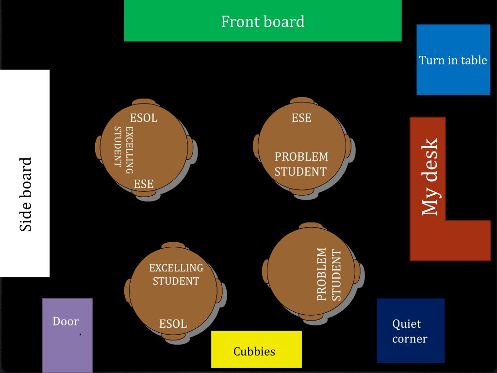 Front board Turn in table ESOL ESE EXCELLING STUDENT PROBLEM STUDENT My desk ESE Side board PROBLEM STUDENT EXCELLINGSTUDENT Door ESOL Quiet corner . Cubbies