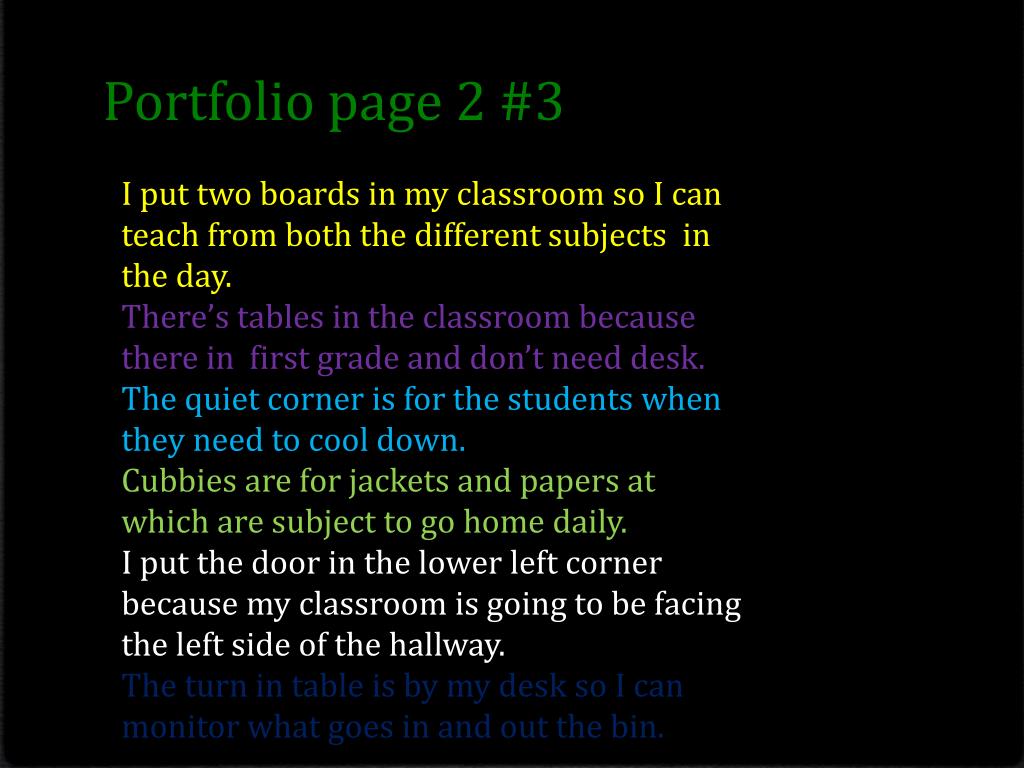 Portfolio page 2 #3 I put two boards in my classroom so I can teach from both the different subjects in the day. There’s tables in the classroom because there in first grade and don’t need desk. The quiet corner is for the students when they need to cool down. Cubbies are for jackets and papers at which are subject to go home daily. I put the door in the lower left corner because my classroom is going to be facing the left side of the hallway. The turn in table is by my desk so I can monitor what goes in and out the bin.