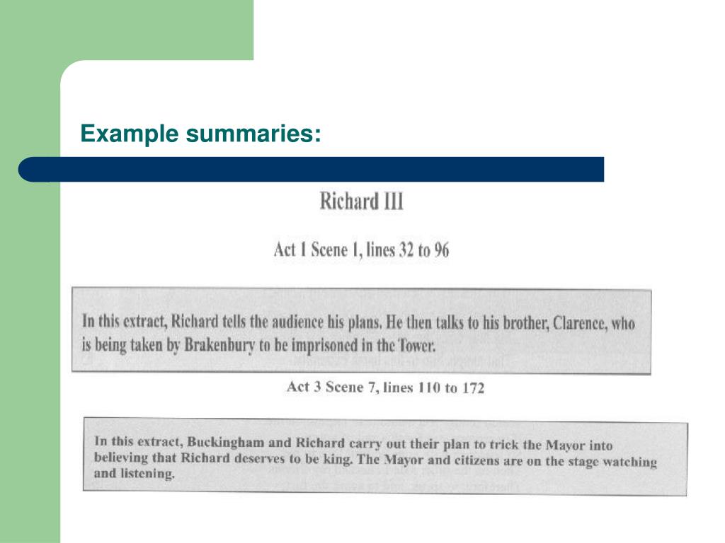 Selecting relevant material: 1. The summaries. On the Test Paper, you will get a summary of each extract in a grey box. This is valuable material to use in your opening paragraph to link the question and the scenes with your opening point of view. Example Question: