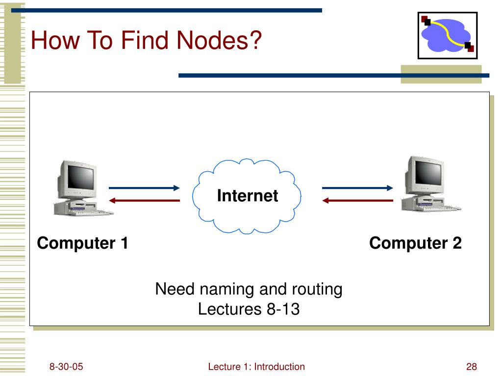 How To Find Nodes? Internet Computer 1 Computer 2 Need naming and routing Lectures 8-13 Lecture 1: Introduction