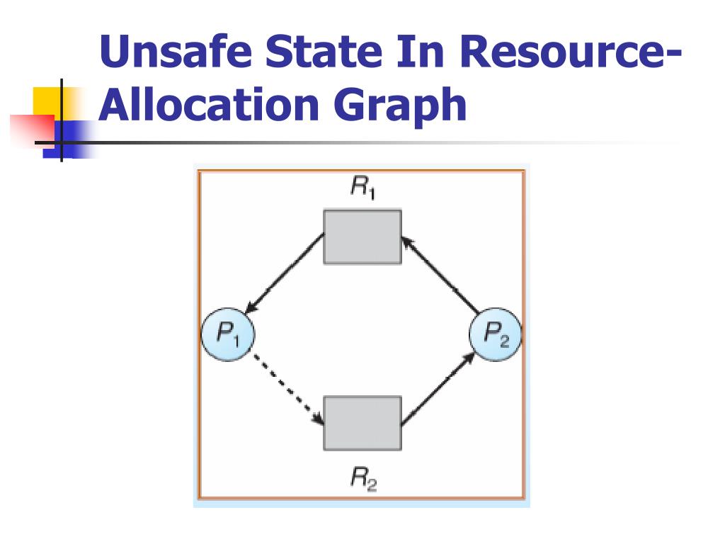 Resource-Allocation Graph Scheme • Claim edge Pi → Rj indicated that process Pj may request resource Rj in the future; represented by a dashed line. • Claim edge converts to request edge when a process requests a resource. • Request edge converted to an assignment edge when the resource is allocated to the process. • When a resource is released by a process, assignment edge reconverts to a claim edge.