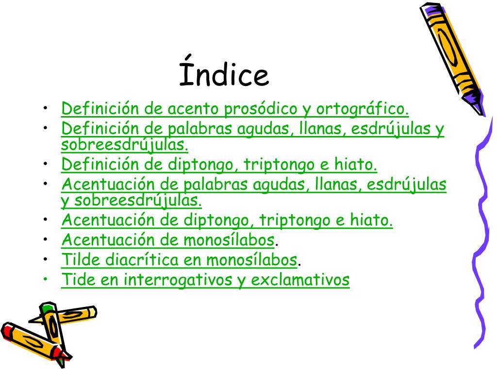 Índice • Definición de acento prosódico y ortográfico. • Definición de palabras agudas, llanas, esdrújulas y sobreesdrújulas. • Definición de diptongo, triptongo e hiato. • Acentuación de palabras agudas, llanas, esdrújulas y sobreesdrújulas. • Acentuación de diptongo, triptongo e hiato. • Acentuación de monosílabos. • Tilde diacrítica en monosílabos. • Tide en interrogativos y exclamativos