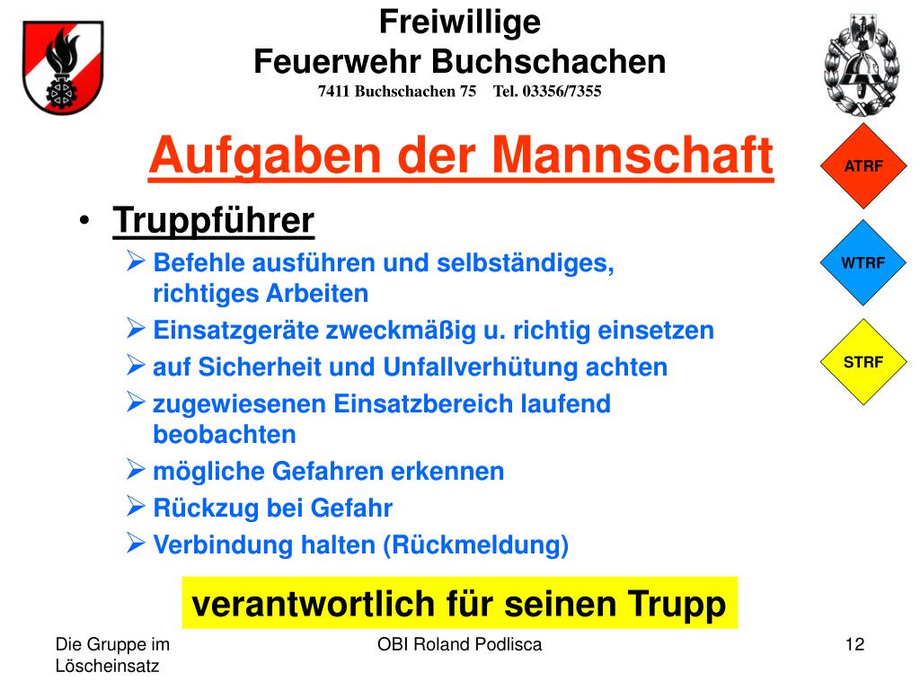 Freiwillige Feuerwehr Buchschachen 7411 Buchschachen 75 Tel. 03356/7355 Aufgaben der Mannschaft ATRF • Truppführer • Befehle ausführen und selbständiges,richtiges Arbeiten • Einsatzgeräte zweckmäßig u. richtig einsetzen • auf Sicherheit und Unfallverhütung achten • zugewiesenen Einsatzbereich laufendbeobachten • mögliche Gefahren erkennen • Rückzug bei Gefahr • Verbindung halten (Rückmeldung) WTRF STRF verantwortlich für seinen Trupp OBI Roland Podlisca