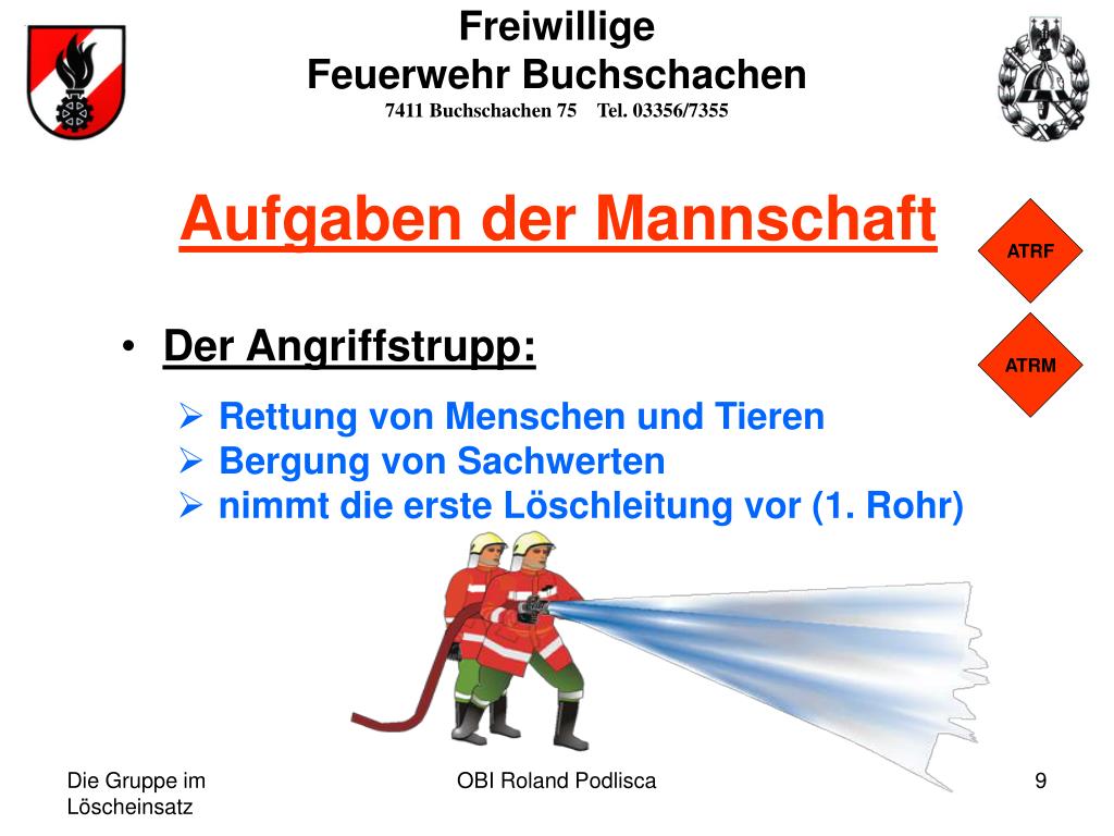 Freiwillige Feuerwehr Buchschachen 7411 Buchschachen 75 Tel. 03356/7355 Aufgaben der Mannschaft ATRF • Der Angriffstrupp: • Rettung von Menschen und Tieren • Bergung von Sachwerten • nimmt die erste Löschleitung vor (1. Rohr) ATRM OBI Roland Podlisca