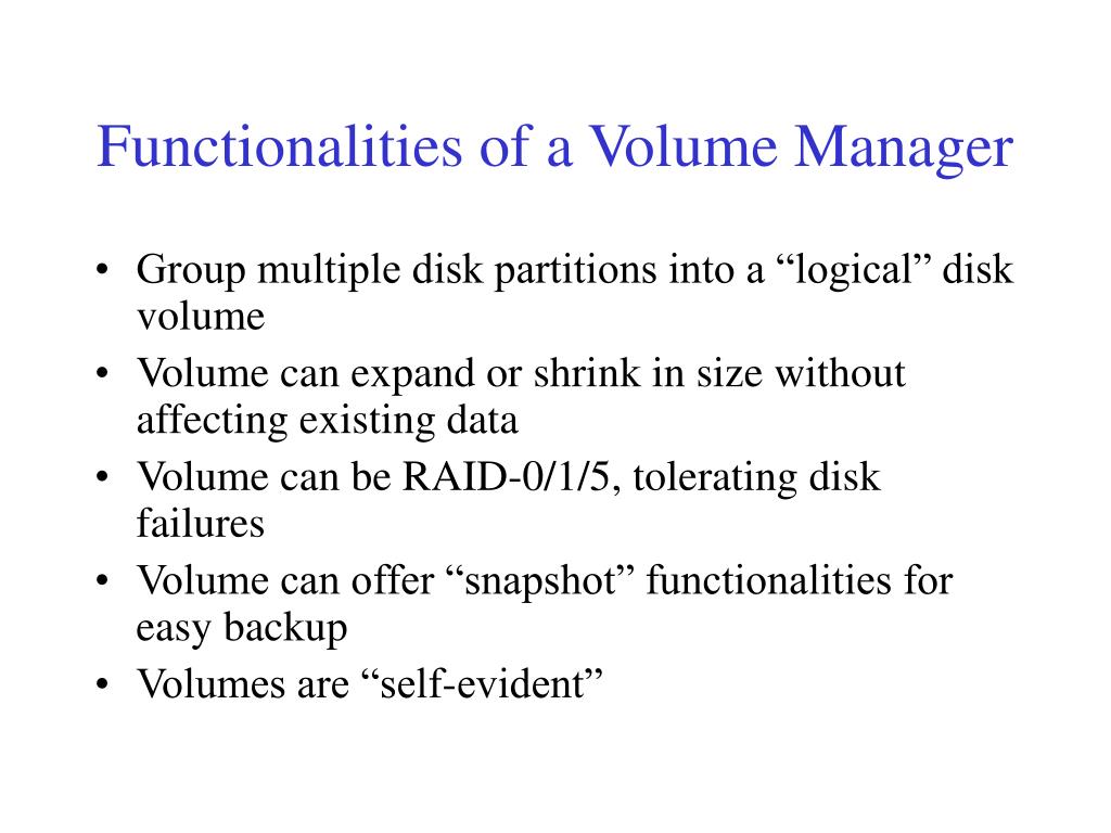 Functionalities of a Volume Manager • Group multiple disk partitions into a “logical” disk volume • Volume can expand or shrink in size without affecting existing data • Volume can be RAID-0/1/5, tolerating disk failures • Volume can offer “snapshot” functionalities for easy backup • Volumes are “self-evident”