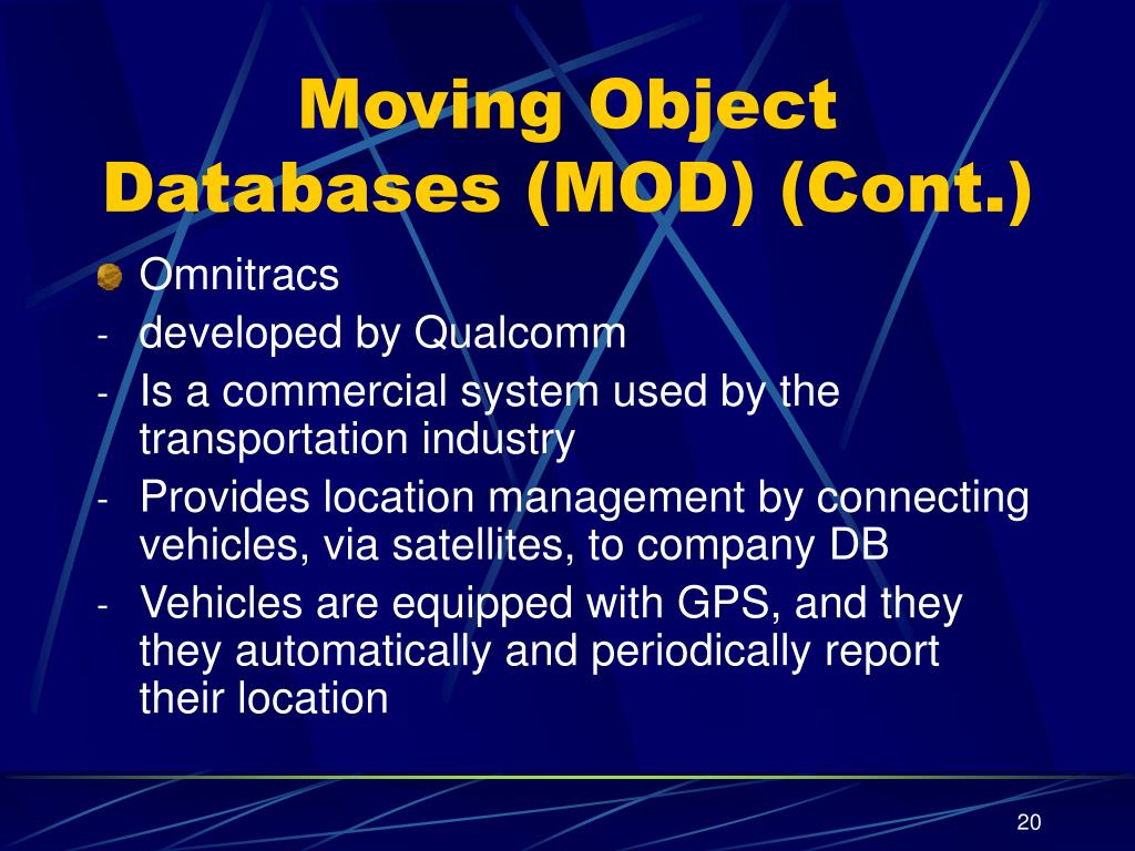 Moving Object Databases (MOD) (Cont.) • Omnitracs • developed by Qualcomm • Is a commercial system used by the transportation industry • Provides location management by connecting vehicles, via satellites, to company DB • Vehicles are equipped with GPS, and they they automatically and periodically report their location