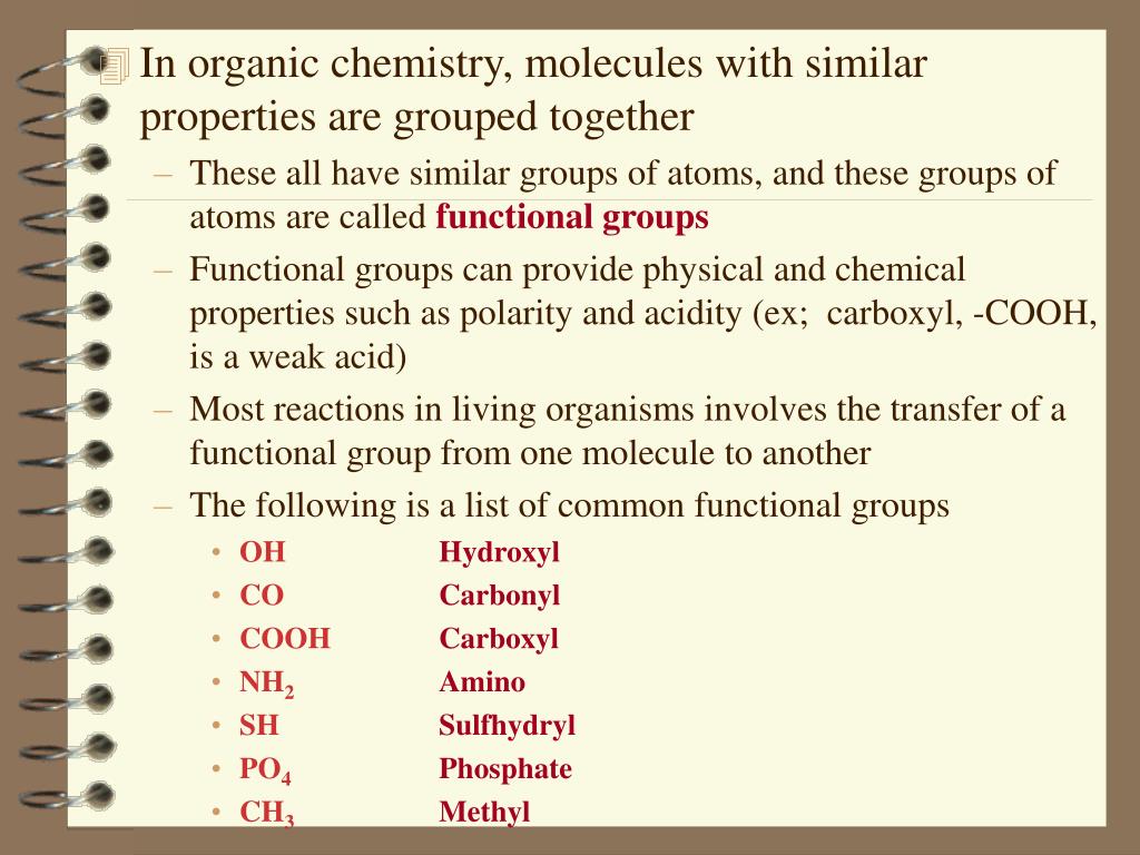 In organic chemistry, molecules with similar properties are grouped together • These all have similar groups of atoms, and these groups of atoms are called functional groups • Functional groups can provide physical and chemical properties such as polarity and acidity (ex; carboxyl, -COOH, is a weak acid) • Most reactions in living organisms involves the transfer of a functional group from one molecule to another • The following is a list of common functional groups • OHHydroxyl • COCarbonyl • COOHCarboxyl • NH2Amino • SHSulfhydryl • PO4 Phosphate • CH3Methyl