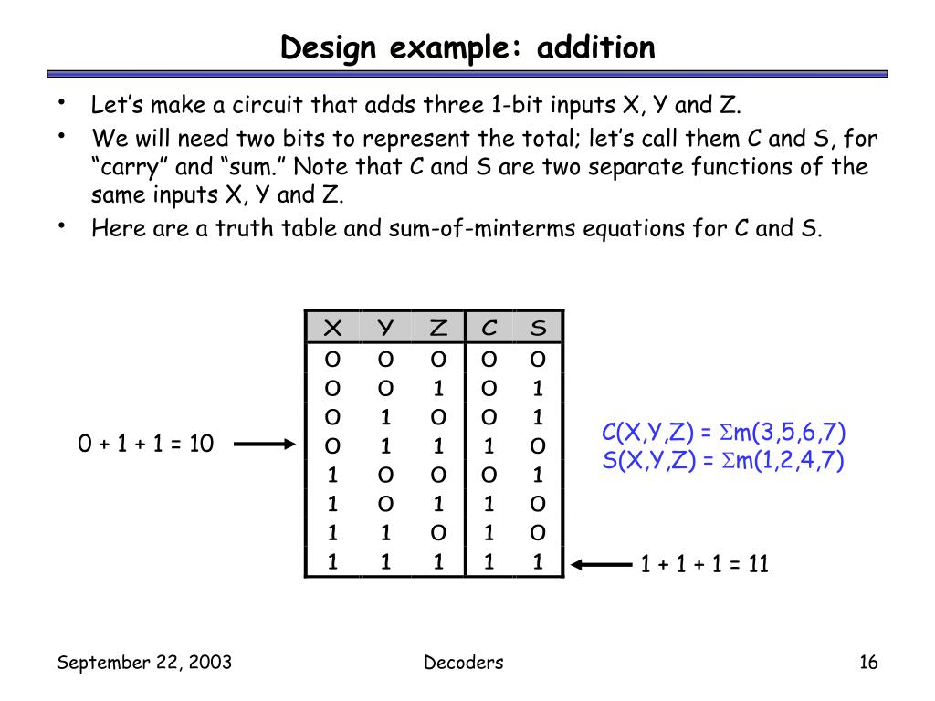 Design example: addition • Let’s make a circuit that adds three 1-bit inputs X, Y and Z. • We will need two bits to represent the total; let’s call them C and S, for “carry” and “sum.” Note that C and S are two separate functionsof the same inputs X, Y and Z. • Here are a truth table and sum-of-minterms equations for C and S. C(X,Y,Z) = m(3,5,6,7) S(X,Y,Z) = m(1,2,4,7) 0 + 1 + 1 = 10 1 + 1 + 1 = 11 Decoders