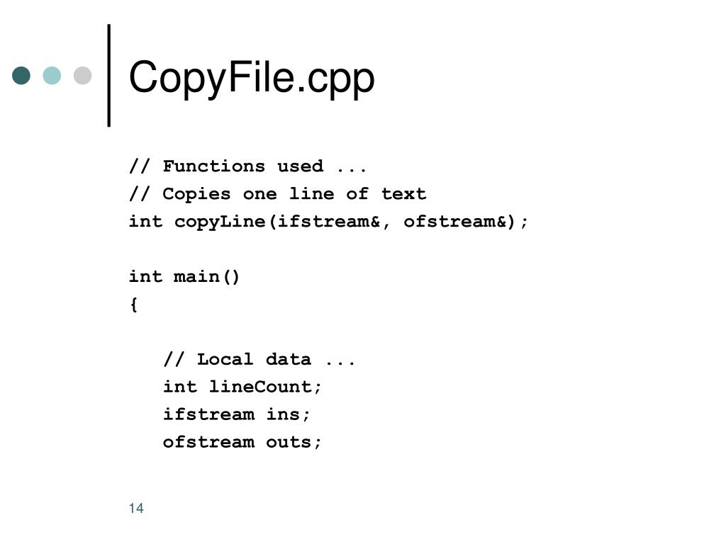 CopyFile.cpp // Functions used ... // Copies one line of text int copyLine(ifstream&, ofstream&); int main() { // Local data ... int lineCount; ifstream ins; ofstream outs;