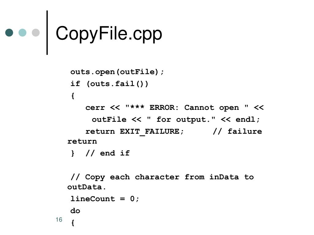 CopyFile.cpp outs.open(outFile); if (outs.fail()) { cerr << "*** ERROR: Cannot open " << outFile << " for output." << endl; return EXIT_FAILURE; // failure return } // end if // Copy each character from inData to outData. lineCount = 0; do {