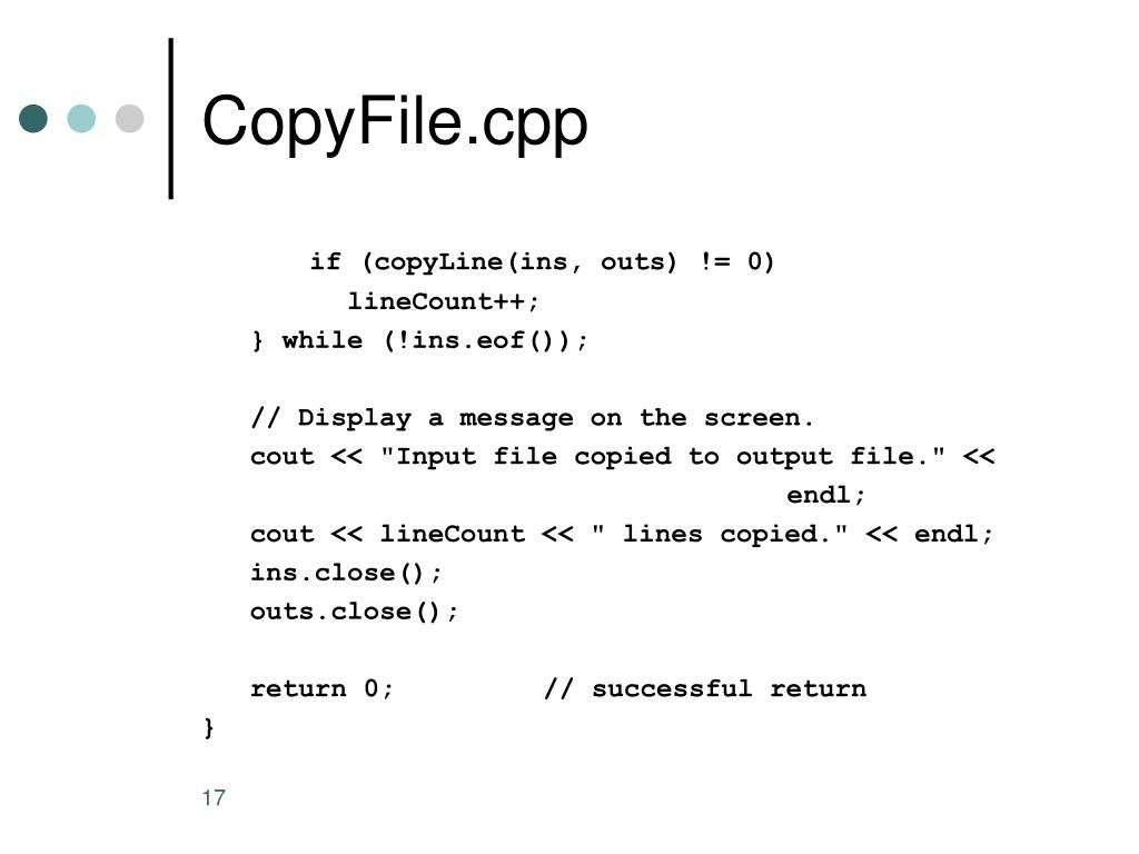 CopyFile.cpp if (copyLine(ins, outs) != 0) lineCount++; } while (!ins.eof()); // Display a message on the screen. cout << "Input file copied to output file." << endl; cout << lineCount << " lines copied." << endl; ins.close(); outs.close(); return 0; // successful return }