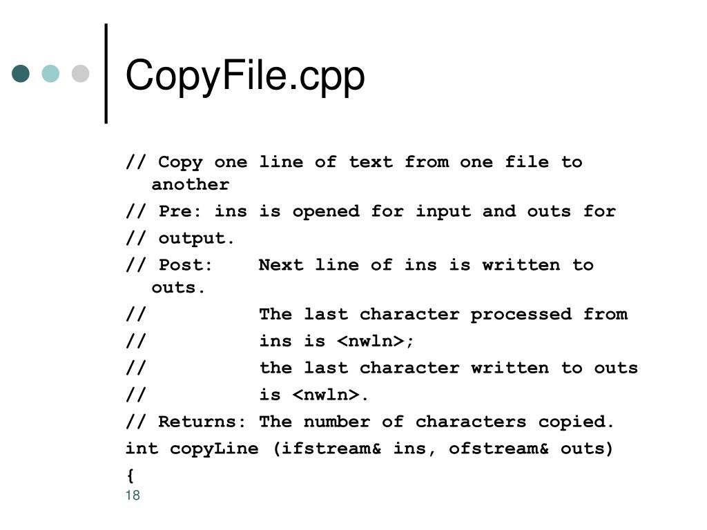 CopyFile.cpp // Copy one line of text from one file to another // Pre: ins is opened for input and outs for // output. // Post: Next line of ins is written to outs. // The last character processed from // ins is <nwln>; // the last character written to outs // is <nwln>. // Returns: The number of characters copied. int copyLine (ifstream& ins, ofstream& outs) {