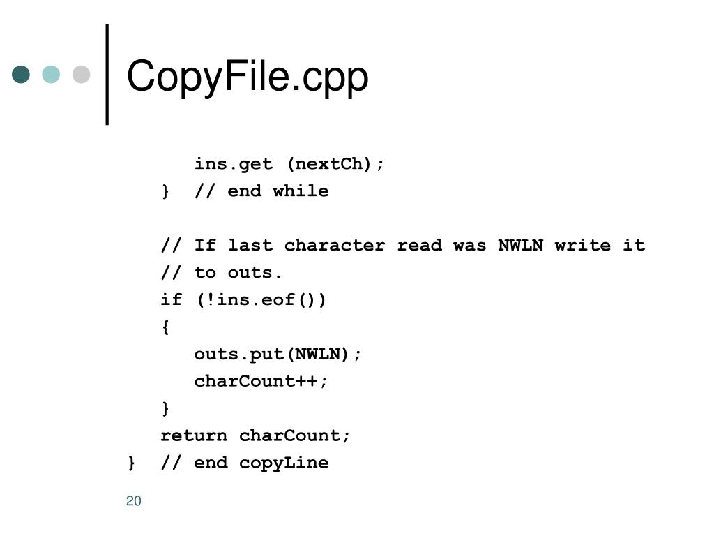 CopyFile.cpp ins.get (nextCh); } // end while // If last character read was NWLN write it // to outs. if (!ins.eof()) { outs.put(NWLN); charCount++; } return charCount; } // end copyLine