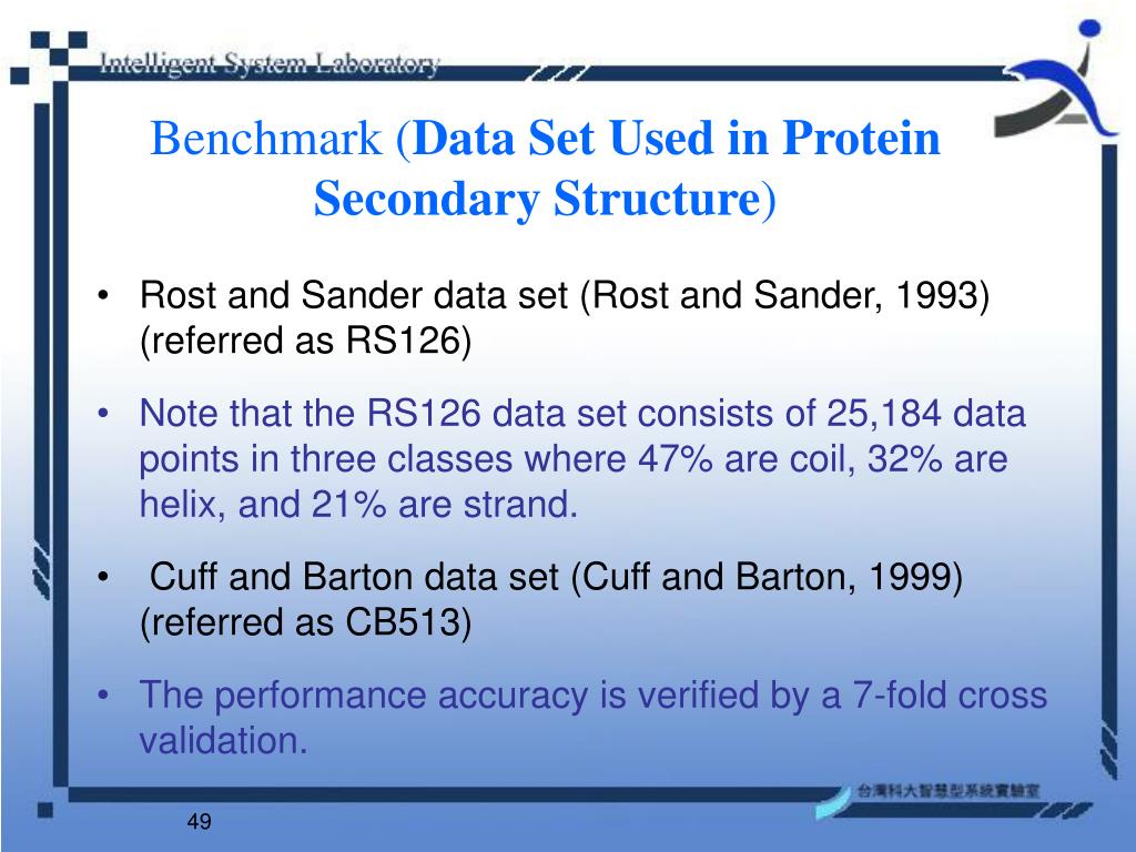 Benchmark (Data Set Used in Protein Secondary Structure) • Rost and Sander data set (Rost and Sander, 1993) (referred as RS126) • Note that the RS126 data set consists of 25,184 data points in three classes where 47% are coil, 32% are helix, and 21% are strand. • Cuff and Barton data set (Cuff and Barton, 1999) (referred as CB513) • The performance accuracy is verified by a 7-fold cross validation.