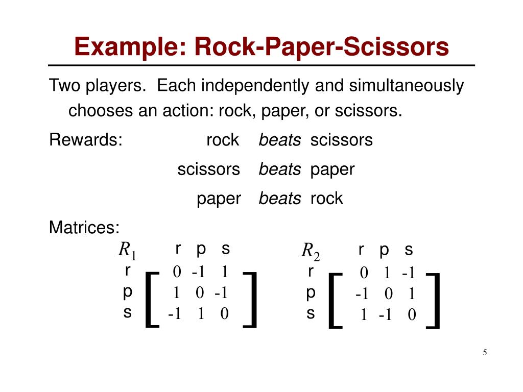 Example: Rock-Paper-Scissors Two players. Each independently and simultaneously chooses an action: rock, paper, or scissors. Rewards: rock beats scissors scissors beats paper paper beats rock Matrices: R1 r - p - s R2 r - p - s [ ] [ ] r p s r p s -0 --1 - 1 - 1 - 0 --1 --1 - 1 - 0 - 0 - 1 --1 --1 - 0 - 1 - 1 --1 - 0