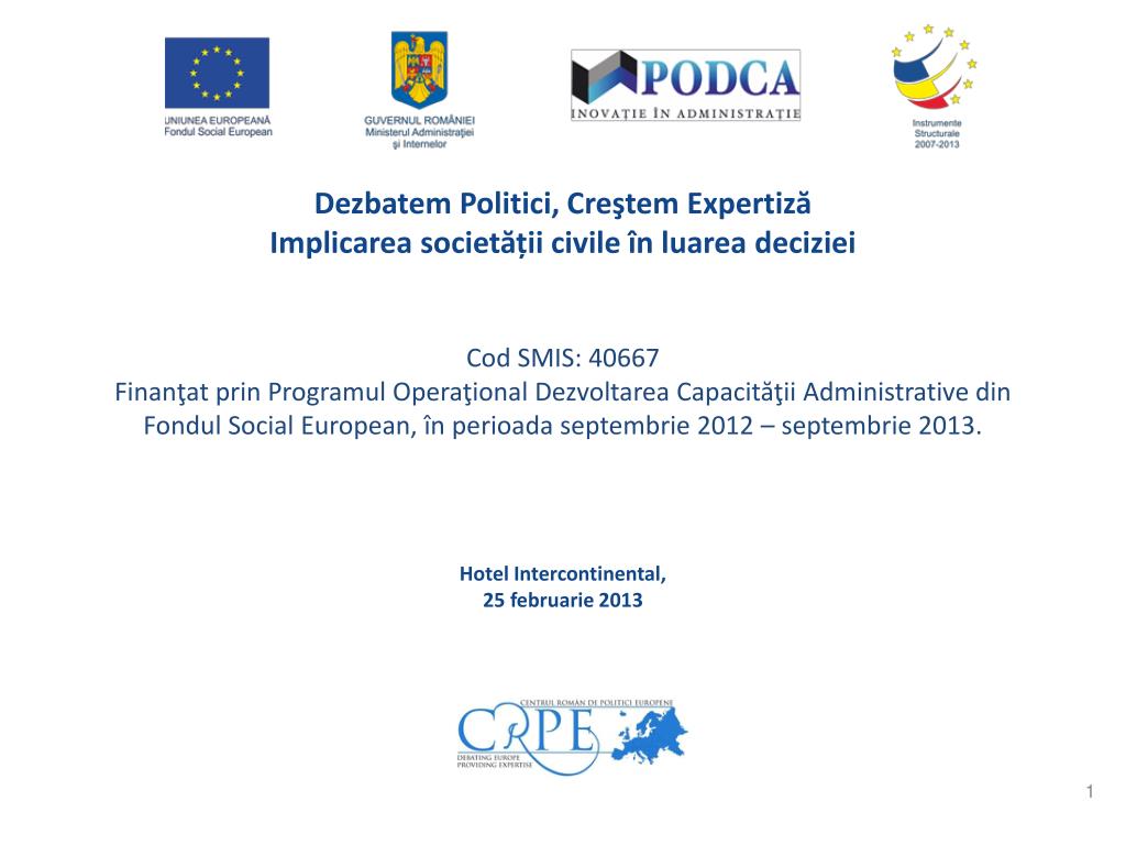 DezbatemPolitici, CreştemExpertizăImplicareasocietățiicivileînluareadecizieiCod SMIS: 40667Finanţat prin Programul Operaţional Dezvoltarea Capacităţii Administrative din Fondul Social European, în perioada septembrie 2012 – septembrie 2013.Hotel Intercontinental, 25 februarie 2013