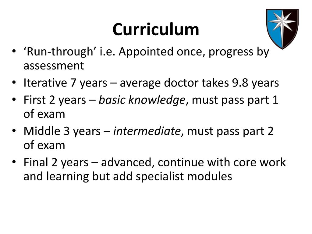Curriculum • ‘Run-through’ i.e. Appointed once, progress by assessment • Iterative 7 years – average doctor takes 9.8 years • First 2 years – basic knowledge, must pass part 1 of exam • Middle 3 years – intermediate, must pass part 2 of exam • Final 2 years – advanced, continue with core work and learning but add specialist modules