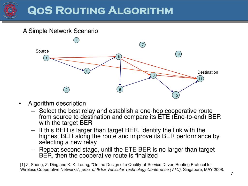 QoS Routing Algorithm A Simple Network Scenario • Algorithm description • Select the best relay and establish a one-hop cooperative route from source to destination and compare its ETE (End-to-end) BER with the target BER • If this BER is larger than target BER, identify the link with the highest BER along the route and improve its BER performance by selecting a new relay • Repeat second stage, until the ETE BER is no larger than target BER, then the cooperative route is finalized 4 7 Source 9 6 1 3 Destination 8 11 2 5 10 [1] Z. Sheng, Z. Ding and K. K. Leung, "On the Design of a Quality-of-Service Driven Routing Protocol for Wireless Cooperative Networks", proc. of IEEE Vehicular Technology Conference (VTC), Singapore, MAY 2008.
