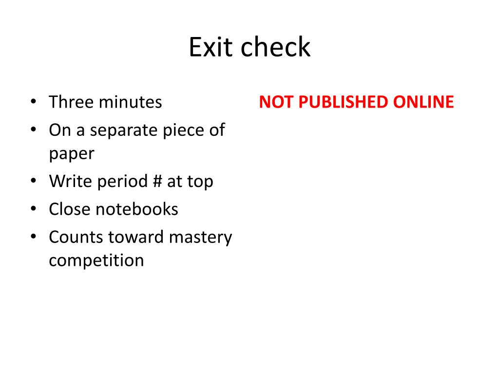 Exit check • Three minutes • On a separate piece of paper • Write period # at top • Close notebooks • Counts toward mastery competition NOT PUBLISHED ONLINE