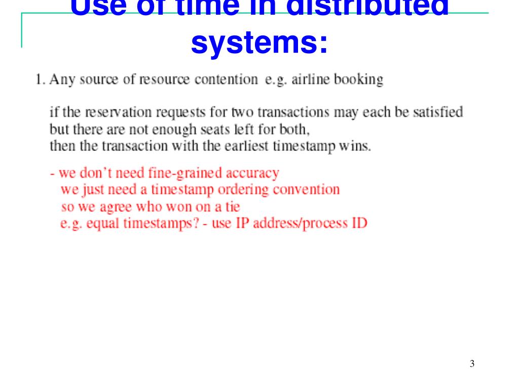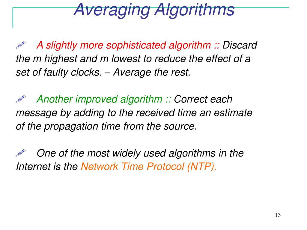 Averaging Algorithms ! A slightly more sophisticated algorithm :: Discard the m highest and m lowest to reduce the effect of a set of faulty clocks. – Average the rest. ! Another improved algorithm :: Correct each message by adding to the received time an estimate of the propagation time from the source. ! One of the most widely used algorithms in the Internet is the Network Time Protocol (NTP).