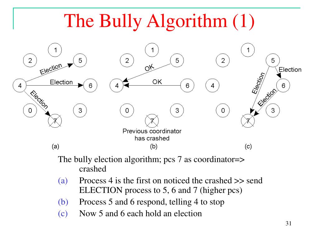 The Bully Algorithm (1) The bully election algorithm; pcs 7 as coordinator=> crashed • Process 4 is the first on noticed the crashed >> send ELECTION process to 5, 6 and 7 (higher pcs) • Process 5 and 6 respond, telling 4 to stop • Now 5 and 6 each hold an election