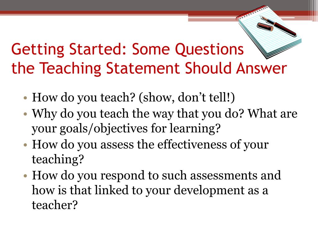 Getting Started: Some Questions the Teaching Statement Should Answer • How do you teach? (show, don’t tell!) • Why do you teach the way that you do? What are your goals/objectives for learning? • How do you assess the effectiveness of your teaching? • How do you respond to such assessments and how is that linked to your development as a teacher?