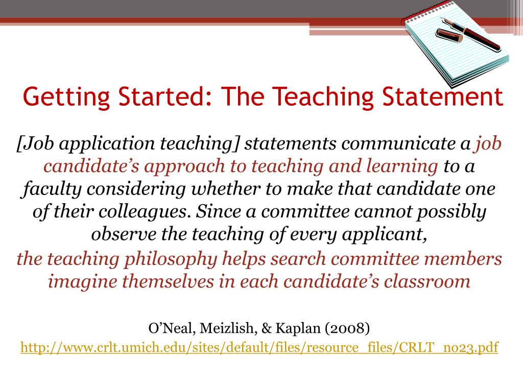 Getting Started: The Teaching Statement [Job application teaching] statements communicate a job candidate’s approach to teaching and learningto a faculty considering whether to make that candidate one of their colleagues. Since a committee cannot possibly observe the teaching of every applicant, the teaching philosophy helps search committee members imagine themselves in each candidate’s classroom O’Neal, Meizlish, & Kaplan (2008) http://www.crlt.umich.edu/sites/default/files/resource_files/CRLT_no23.pdf