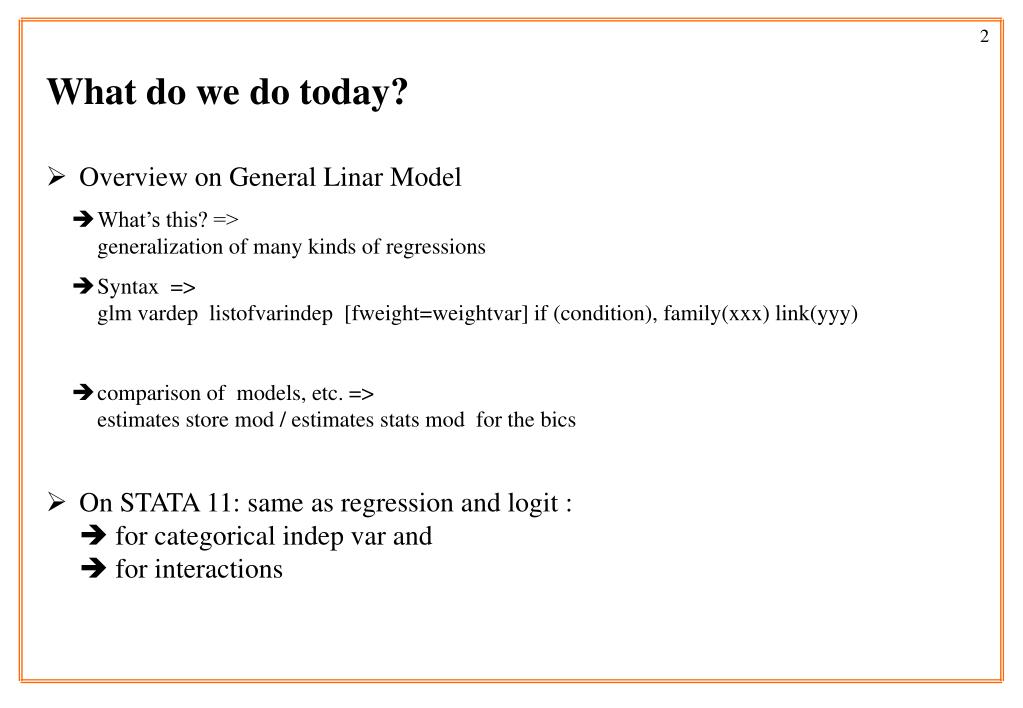 What do we do today? • Overview on General Linar Model • What’s this? =>generalization of many kinds of regressions • Syntax =>glm vardep listofvarindep [fweight=weightvar] if (condition), family(xxx) link(yyy) • comparison of models, etc. => estimates store mod / estimates stats mod for the bics • On STATA 11: same as regression and logit : for categorical indep var and for interactions