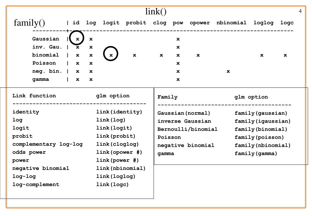 link() family() • | id log logit probit clog pow opower nbinomial loglog logc • ----------+------------------------------------------------------------------- • Gaussian | x x x • inv. Gau. | x x x • binomial | x x x x x x x x x • Poisson | x x x • neg. bin. | x x x x • gamma | x x x • Family glm option • ---------------------------------------- • Gaussian(normal) family(gaussian) • inverse Gaussian family(igaussian) • Bernoulli/binomial family(binomial) • Poisson family(poisson) • negative binomial family(nbinomial) • gamma family(gamma) • Link function glm option • ---------------------------------------- • identity link(identity) • log link(log) • logit link(logit) • probit link(probit) • complementary log-log link(cloglog) • odds power link(opower #) • power link(power #) • negative binomial link(nbinomial) • log-log link(loglog) • log-complement link(logc)