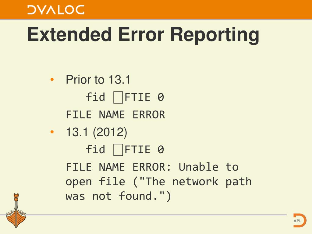 Extended Error Reporting Prior to 13.1 fid ⎕FTIE 0 FILE NAME ERROR 13.1 (2012) fid ⎕FTIE 0 FILE NAME ERROR: Unable to open file ("The network path was not found.")