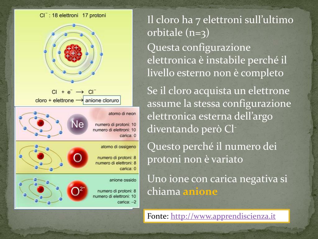 Il cloro ha 7 elettroni sull’ultimo orbitale (n=3) Questa configurazione elettronica è instabile perché il livello esterno non è completo Se il cloro acquista un elettrone assume la stessa configurazione elettronica esterna dell’argo diventando però Cl- Questo perché il numero dei protoni non è variato Uno ione con carica negativa si chiama anione Fonte: http://www.apprendiscienza.it