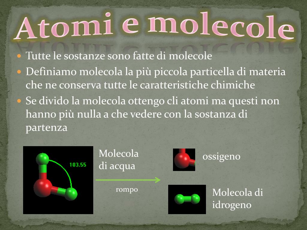 Atomi e molecole • Tutte le sostanze sono fatte di molecole • Definiamo molecola la più piccola particella di materia che ne conserva tutte le caratteristiche chimiche • Se divido la molecola ottengo cli atomi ma questi non hanno più nulla a che vedere con la sostanza di partenza Molecola di acqua ossigeno rompo Molecola di idrogeno