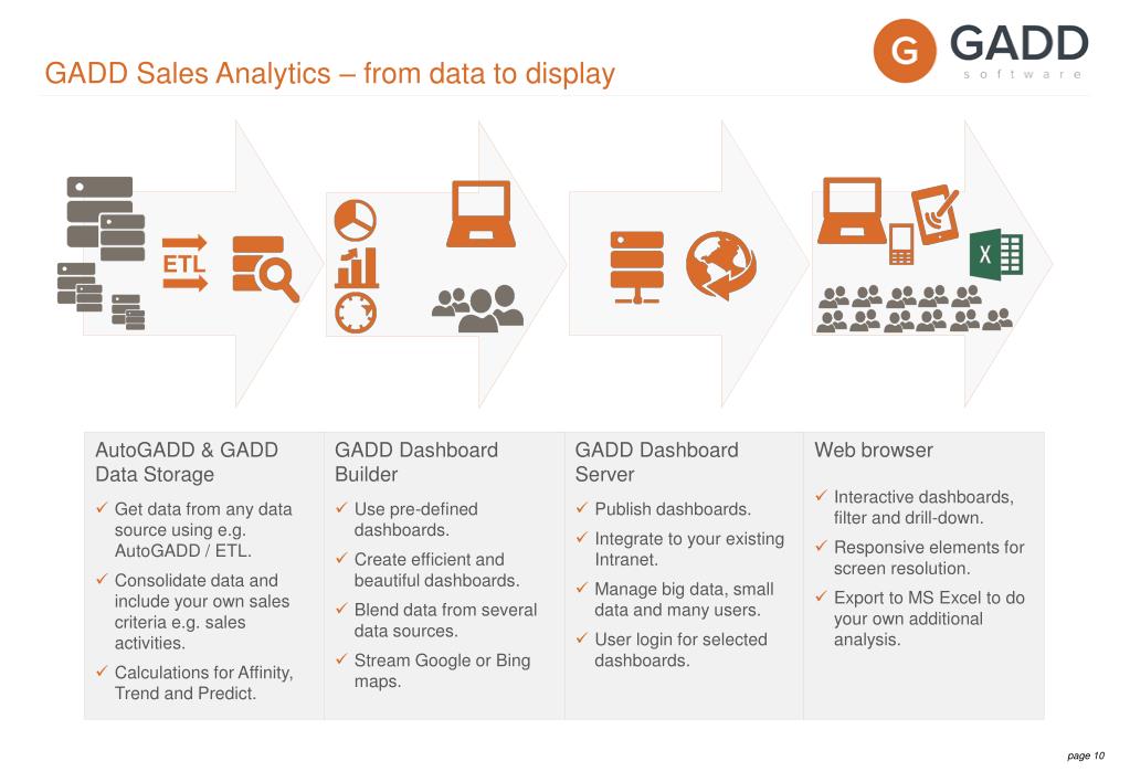 GADD Sales Analytics – from data to display ETL • AutoGADD & GADD Data Storage • Get data from any data source using e.g. AutoGADD / ETL. • Consolidate data and include your own sales criteria e.g. sales activities. • Calculations for Affinity, Trend and Predict. • GADD Dashboard Builder • Use pre-defined dashboards. • Create efficient and beautiful dashboards. • Blend data from several data sources. • Stream Google or Bing maps. • GADD Dashboard Server • Publish dashboards. • Integrate to your existing Intranet. • Manage big data, small data and many users. • User login for selected dashboards. • Web browser • Interactive dashboards, filter and drill-down. • Responsive elements for screen resolution. • Export to MS Excel to do your own additional analysis.