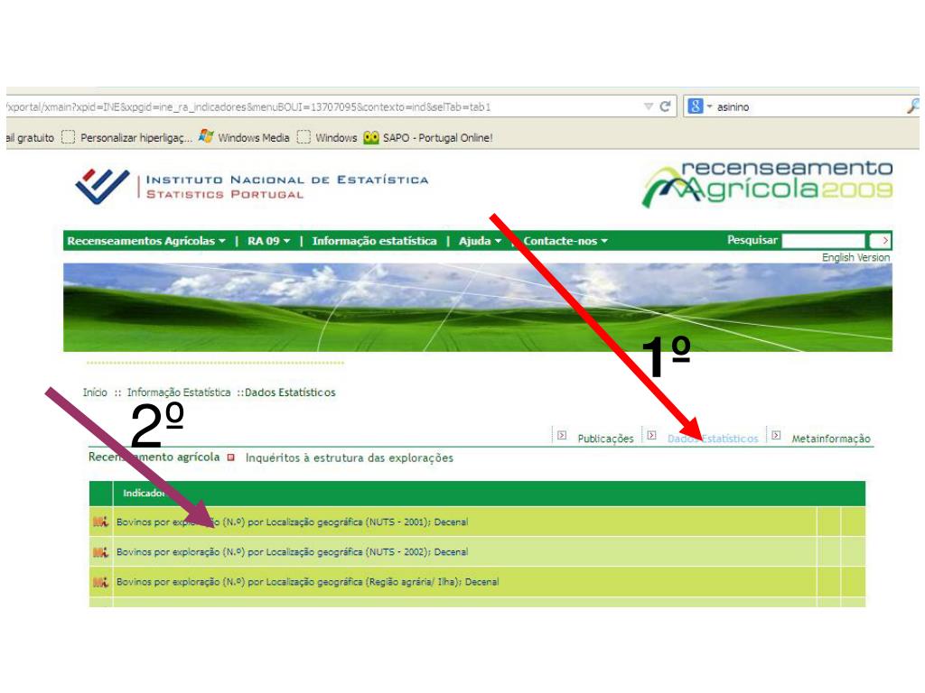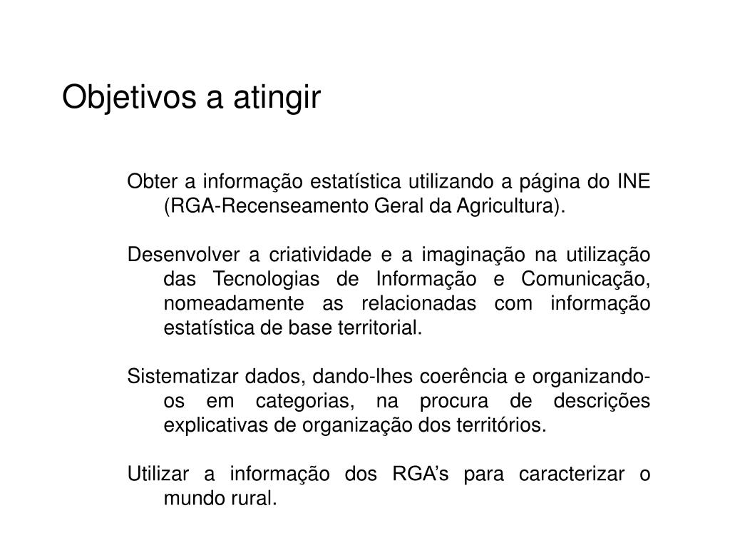 Objetivos a atingir • Obter a informação estatística utilizando a página do INE (RGA-Recenseamento Geral da Agricultura). • Desenvolver a criatividade e a imaginação na utilização das Tecnologias de Informação e Comunicação, nomeadamente as relacionadas com informação estatística de base territorial. • Sistematizar dados, dando-lhes coerência e organizando-os em categorias, na procura de descrições explicativas de organização dos territórios. • Utilizar a informação dos RGA’s para caracterizar o mundo rural.